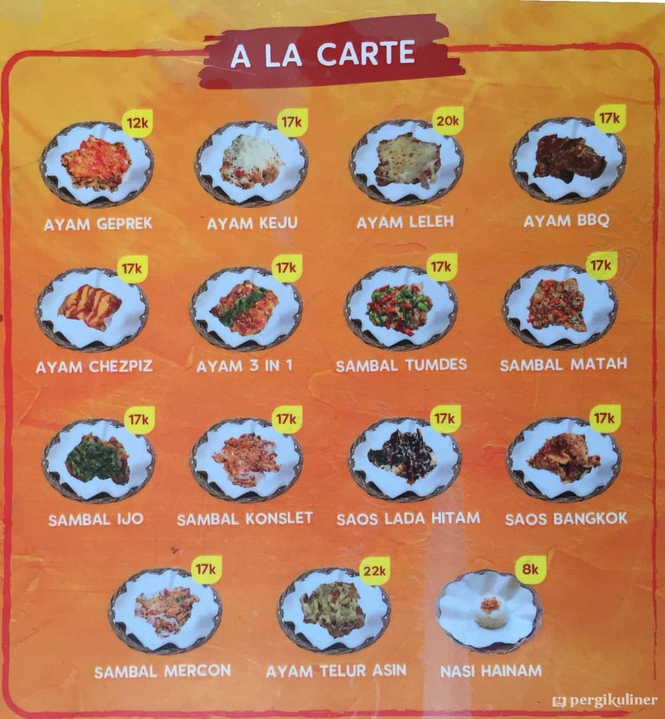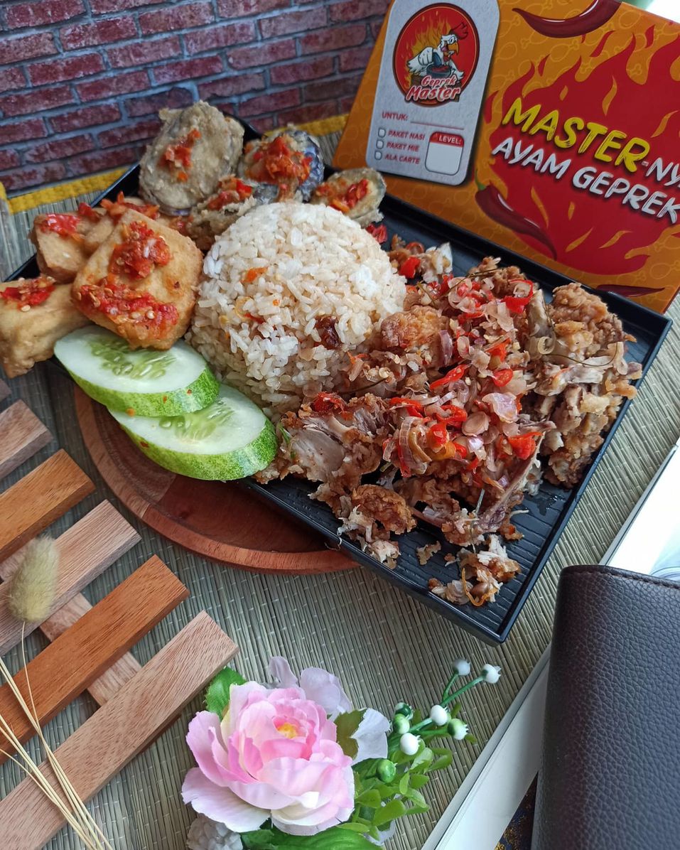 Destinasi makanan Indonesia yang menyajikan ayam geprek dan ayam goreng.