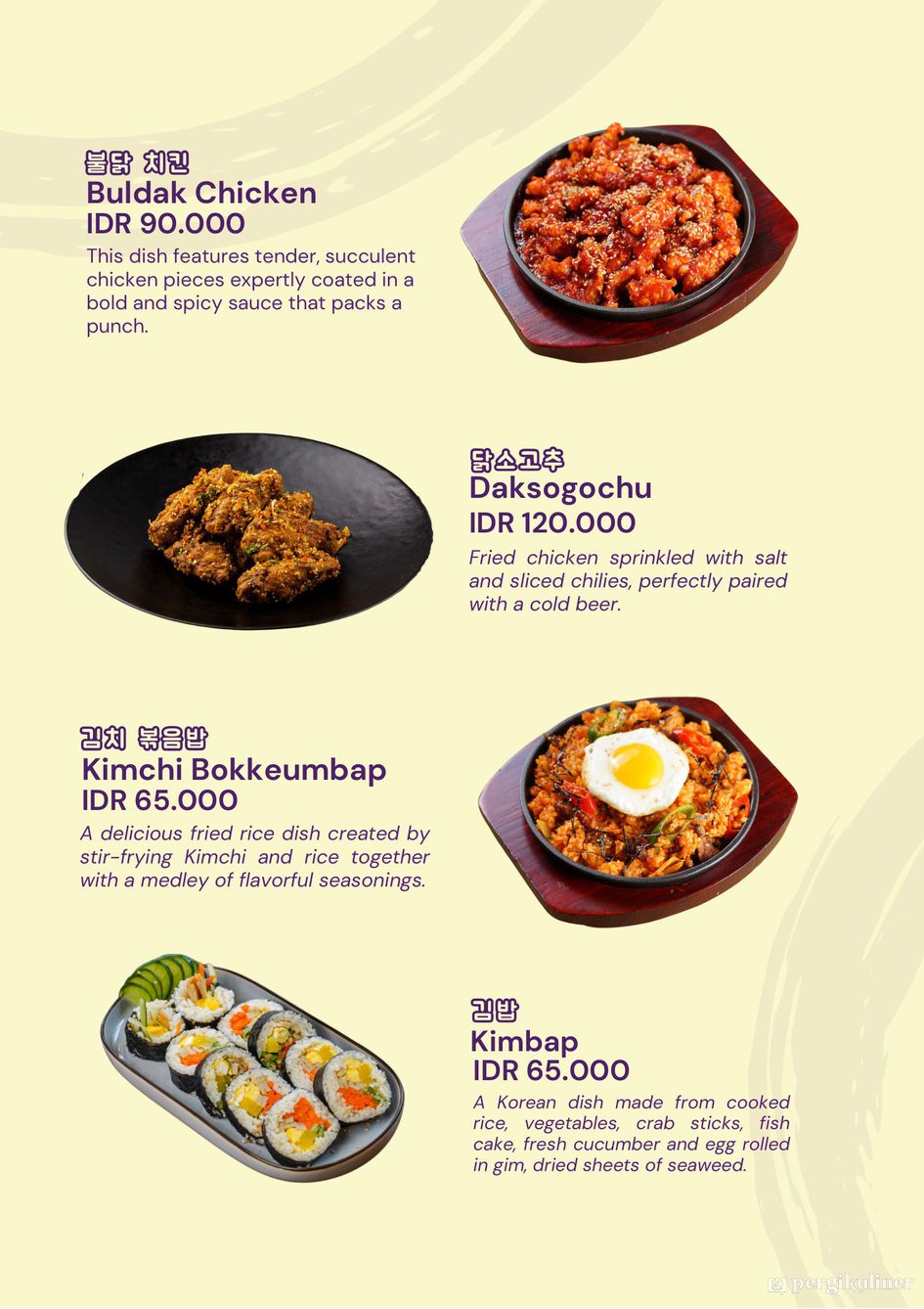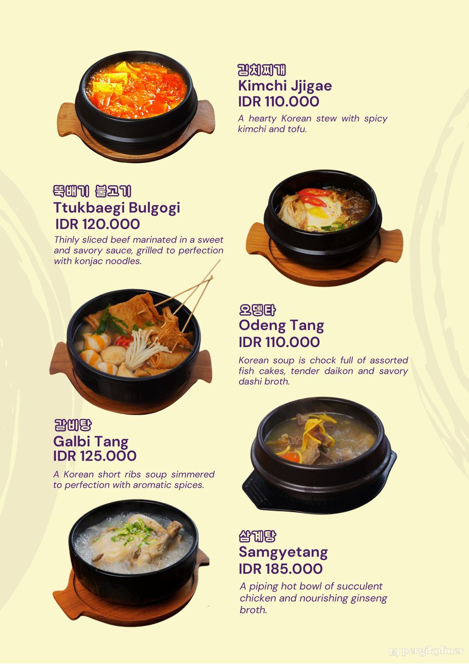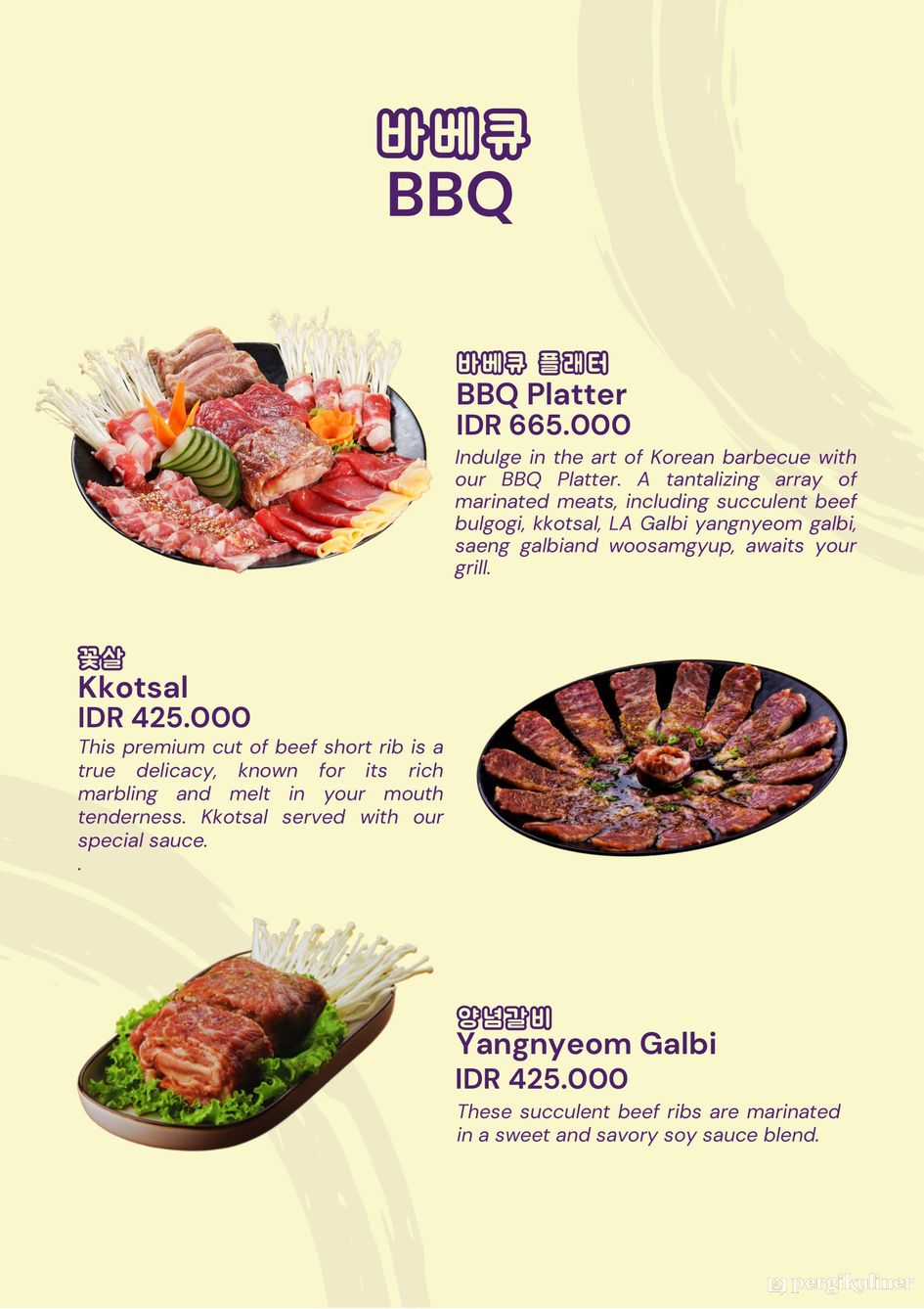 Menyediakan berbagai hidangan khas Korea seperti BBQ, jjampong dan samgyetang.