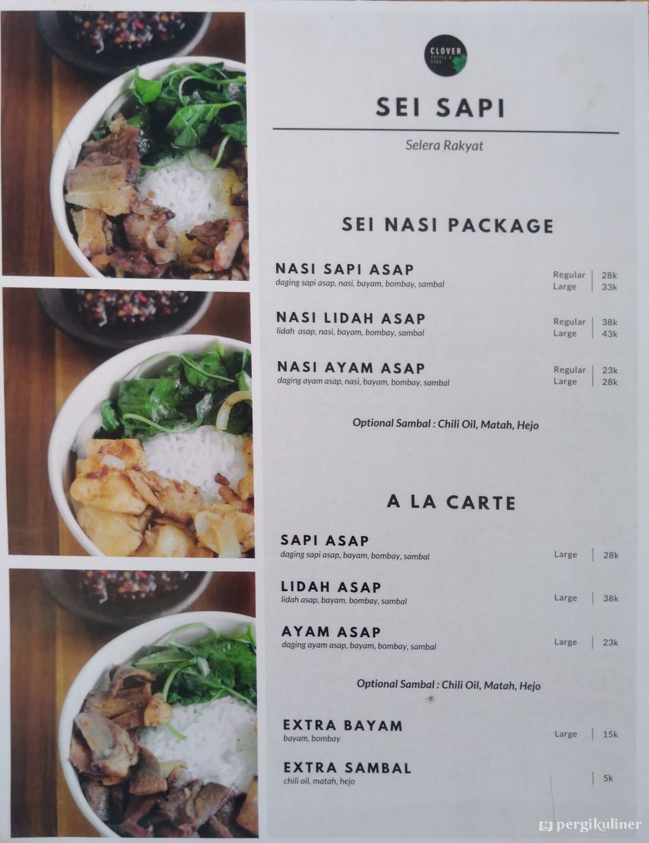 Tempat ini menyajikan beragam pilihan makanan dan minuman, salah satunya adalah nasi sei sapi atau ayam.